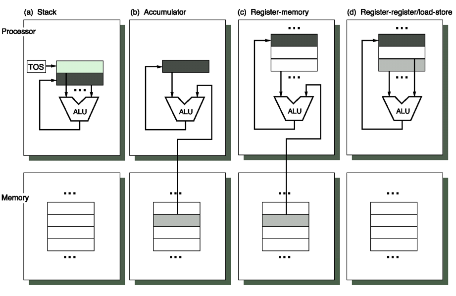 • Register-register/load-store: Both operands come from registers, load/store to copy to/from memory